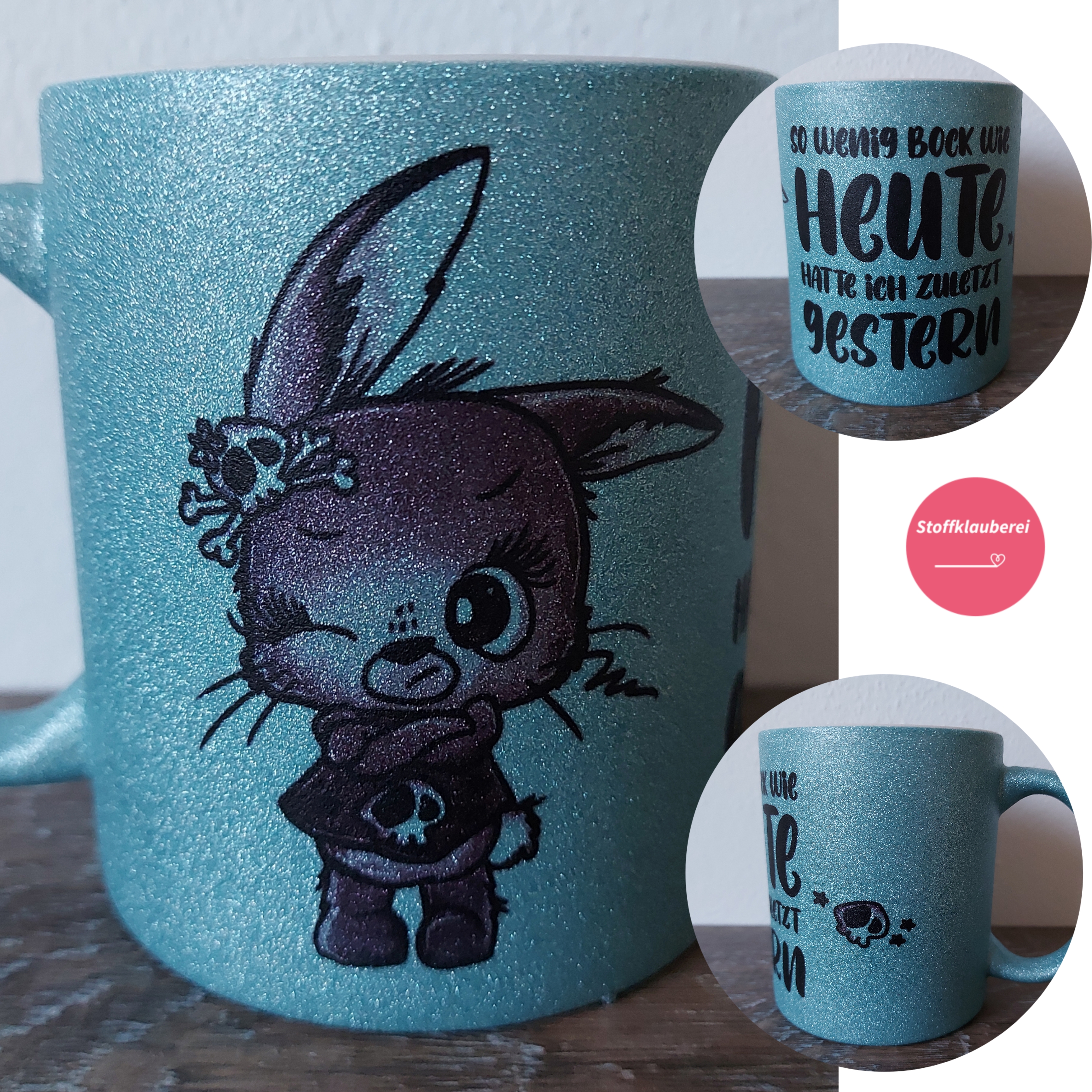 Auf Nachfrage kann das Motiv auch auf anderen Glitzertassenfarben gefertigt werden.